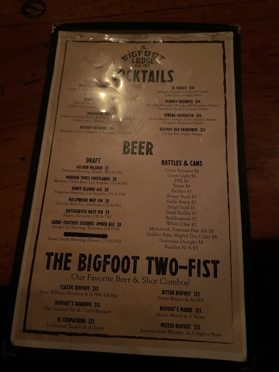 Welcome to Bigfoot Lodge, an enchanting spot nestled at 3172 Los Feliz Blvd, Los Angeles. Known for its captivating atmosphere and lively camaraderie, Bigfoot Lodge is the perfect escape for friends looking to unwind. Although the menu doesn't feature food, the bar offers a mouthwatering array of drinks that are consistently praised by customers.